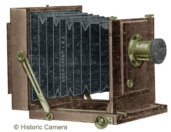 The Scenagraph stand camera was manufactured by the E & T Underwood company in circa 1898. A quality camera featuring a double extension bellows and a choice of either a Meniscus or a Rapid Rectilinear lens with iris diaphragms. Constructed of polished mahogany and with a leather bellows. Made in three sizes, a quarter plate, a half plate and a whole plate. A tripod was sold with the camera. Prices ranged from £1 11s 6 to £4 4s 0d for the camera and Meniscus lens depending on size and from £2 2s 0 to £4 8s 0d for the camera and a Rapid Rectilinear lens.