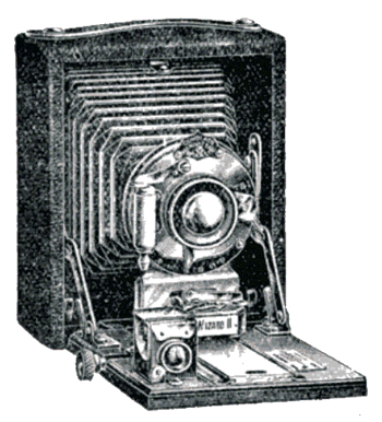 The Pocket Wizard was manufactured by the Manhattan Optical Co. in circa 1899. Designed for 4 1/4 by 3 1/4 photos. Constructed of a mahogany box, leather covered with a rapid rectillinear lens and automatic shutter with finger and pnematic release. The front was rising, faling and side swing with a brilliant finder for focusing. The camera had a compact design measuring 1 7/8 x 4 1/4 x 5 1/8 when closed and weighed 16 ounces. Two models were available. The No. 1 was provided with a double plate holder and the No. 2 had a diagonal precision rack and pinion attachment, extra plate holders and a leather case to hold the camera and three slides.