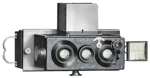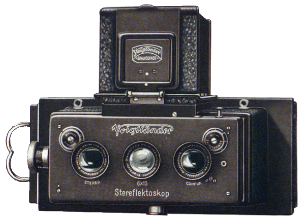 The Stereofectoskop line of cameras were manufactured by Voigtlander & Sohns AG from approximately 1914 to 1937. Designed as a modern Stereo-reflex camera with three lenses and made in two sizes, 45 x 107mm and 6 x 13 cm. Through out the years of manufacture several variations and features were added or changed. Working as a true reflex, the viewing image was available to see in the top focusing screen up to the moment of exposure. I was originally fitted with Heliar lens for both the taking and viewing lens. The shutter was a Compur with speeds up to 1/250th of a second. It was made of metal and covered in leather. Other features included a rack and pinion focusing screen with engraved scale, special reflex focusing screen with sunck spirit level protected by a self-erecting metal hood with focusing magnifier, and an all metal changing box for twelve ordinary or eight color plates with plate indicator. The 45 x 107mm was retail priced at $125 and the 6x13cm was priced at $150.
