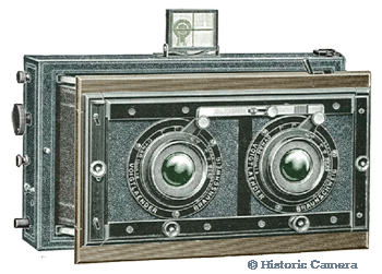 The Stereoscopic Folding Cameras were manufactured by Voightlander & Sohn A.G. in circa 1905. Constructed of wood with leather covering the box and front accents. Fitted with a matching pair of Collinar series II or series III lenses in a focusing mount. Made in two sizes, a 3 1/4 x 6 3/4 inch (9x18cm) size or a 4 x 6 inch (10x15cm) size. Prices ranged from £19 8s to £20 18s.