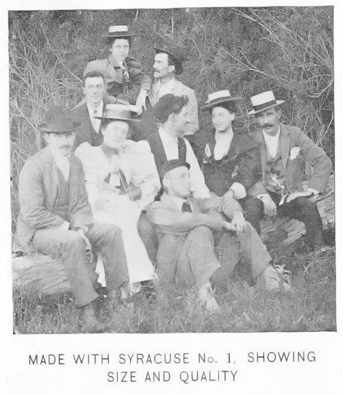 The No. 1 Syracuse camera was manufactured by the Wilkin-Welsh Camera company in circa 1901. The No. 1 was described as a perfect working and practical camera making sharp, clear pictures, 2 1/1 x 2 1/2 inch square. A strong and compact camera covered with black grain morocco with a capacity to hold three double plate holders and view finder. The lens was a universal fixed focus and the shutter was specially designed for this camera. It was self-setting and can be readily changed to either time or instantaneous. Originally priced at $2.00 for camera.