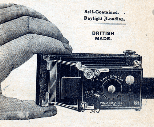When closed the Esignette measures 3 7/8 x 1 7/8 inches, and is only 1 inch in thickness. It opens and lockes in position for exposure by one simple movement. it is the only really small folding camera that is self contained, and will go into the waistcoat pocket, and it is thinner than any camera in existence. The ensignette is loaded and unloaded in daylightwith special six-exposure ensign roll films.