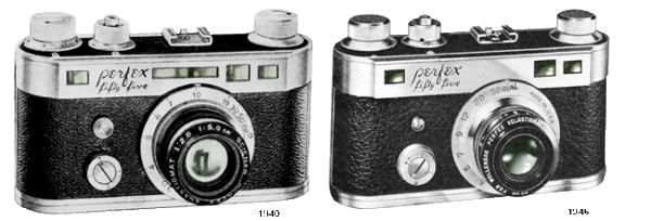 The Perfex Fifty-Five was manufactured by the Candid Camera Corporation of America company from 1940 to 1947. The Fifty-Five camera body was constructed of die cast aluminum and covered in black leather, with chrome metal trim. Capable of accepting standard 35mm roll film, with Either 18 or 36 exposure count. It featured coupled "long base" rangefinder with automatic focusing in 1940 and was phased out by 1946. It came fitted with a new Wollensak Velostigmat coated f3.5 or f2.8 lens. Other features included a built-in flash synchonizer, interchangeable lens and a built-in extinction type" exposure meter, an accurate cloth focal plane shutter providing speeds for 1/25 to 1/500th of a second, and a GRAF Perfex Anastigmat f3.5 lens. Priced at $44.50 or the F3.5 lens and %59.50 for the f2.8 lens.