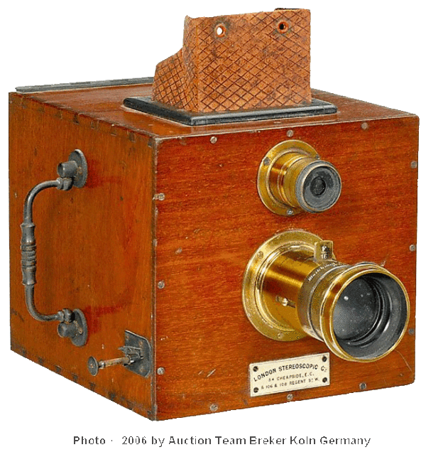The Artist Hand Camera was manufactured by E. Francais, Paris and marketed and sold through the London Stereoscopic & Photographic Co. Ltd. in circa 1890. Designed with two points in mind, extreme portability and compactness combined with utility. Intended for artists and cyclists on tour. The lens, instantaneous shutter and dark slides are inside hidden from view when the camera is not in use. This camera was made in three sizes, a handy 4 1/4 x 3 1/4 inch size that is very portable, it was also made in a half plate size ( 6 1/2 x 4 3/4 inches) and a 5 x 4 stereoscopic size. Prices ranged from £10 10s 0d to £15 15s 0d.