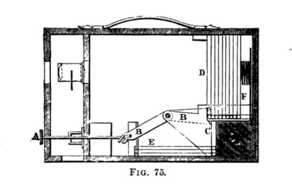 The Carlton hand Camera was manufactured by the London Stereoscopic & Company Ltd in circa 1898. The camera box was constructed of mahogany, covered in leather and all working parts made of metal. It was fitted with a Black Band Radpid Rectilinear lens with revolving diaphragm. The shutter was an improved version with a speed indicator providing settings from one second to 1/100th of a second. The Carlton was made in three sizes, a quarter plate priced at £8 8s; a 5 x 4 inch size priced at £10 10s; and a half plate size priced at £15 15s.