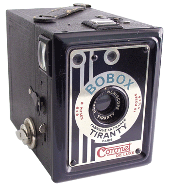 The BOBOX camera was manufactured by the Coronet Camera Co. of the UK, in partnership with Tiranty Company located in Paris, France, due to import restrictions imposed by the French government after WWII. It was also labeled as a Coronet De Luxe. The camera was designed as an inexpensive box camera for taking eight 6 x 9 cm exposures or sixteen 4 1/2 x 6 cm sized exposures on number 120 roll film. It featured a Tiranty meniscope lens and instantaneous shutter. Constructed of wood and covered in black leatherette with a metal decorative faceplate.