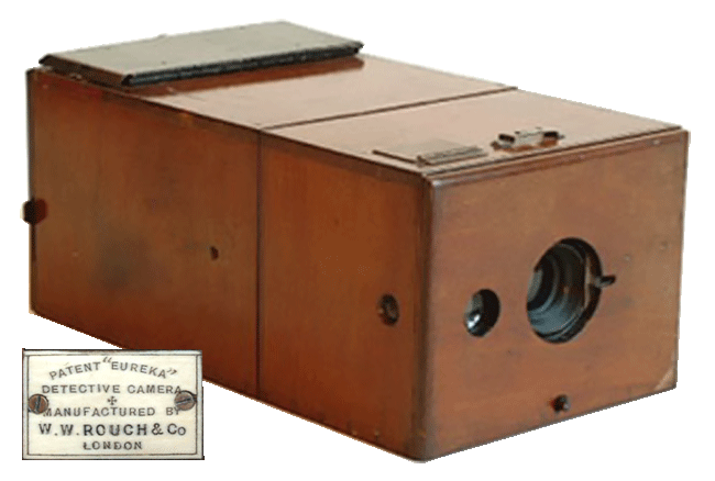 The Eureka Detective Hand Camera was manufactured by W.W. Rouch & Co, of London, England in circa 1888. It was patented in 1887. This camera was constructed of mahogany, highly polished, with brass hardware. It featured a magazine for 12 exposures on quarter plates sized plates, an external daylight plate changing bag made of leather. It was fitted with a Rouch brass lens with waterhouse stops, and a roller blind shutter behind the lens.