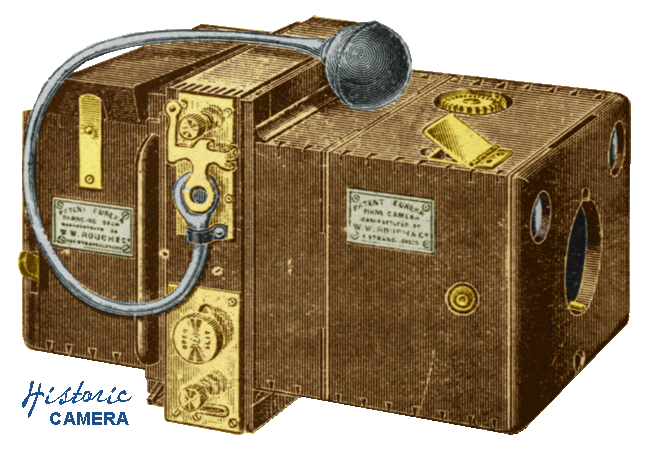The Eureka Focal Plane Detective Hand Camera was manufactured by W.W. Rouch & Co, of London, England in circa 1910. This camera was similar to the original Eureka Detective camera except it had an improved focal plane shutter. It was constructed of mahogany, highly polished, with brass hardware. It featured a magazine for 12 exposures, two brilliant finders, detachable back and it was fitted with a Rouch's Planastigmat lens. This camera was made in three sizes, including a 4 1/4 x 4 1/3 inch quarter plate priced at £10 10 0, a 5 x 4 inch priced at £13 13 0 and a 6 1/2 x 4 3/4 inch. priced at £16 16 0.