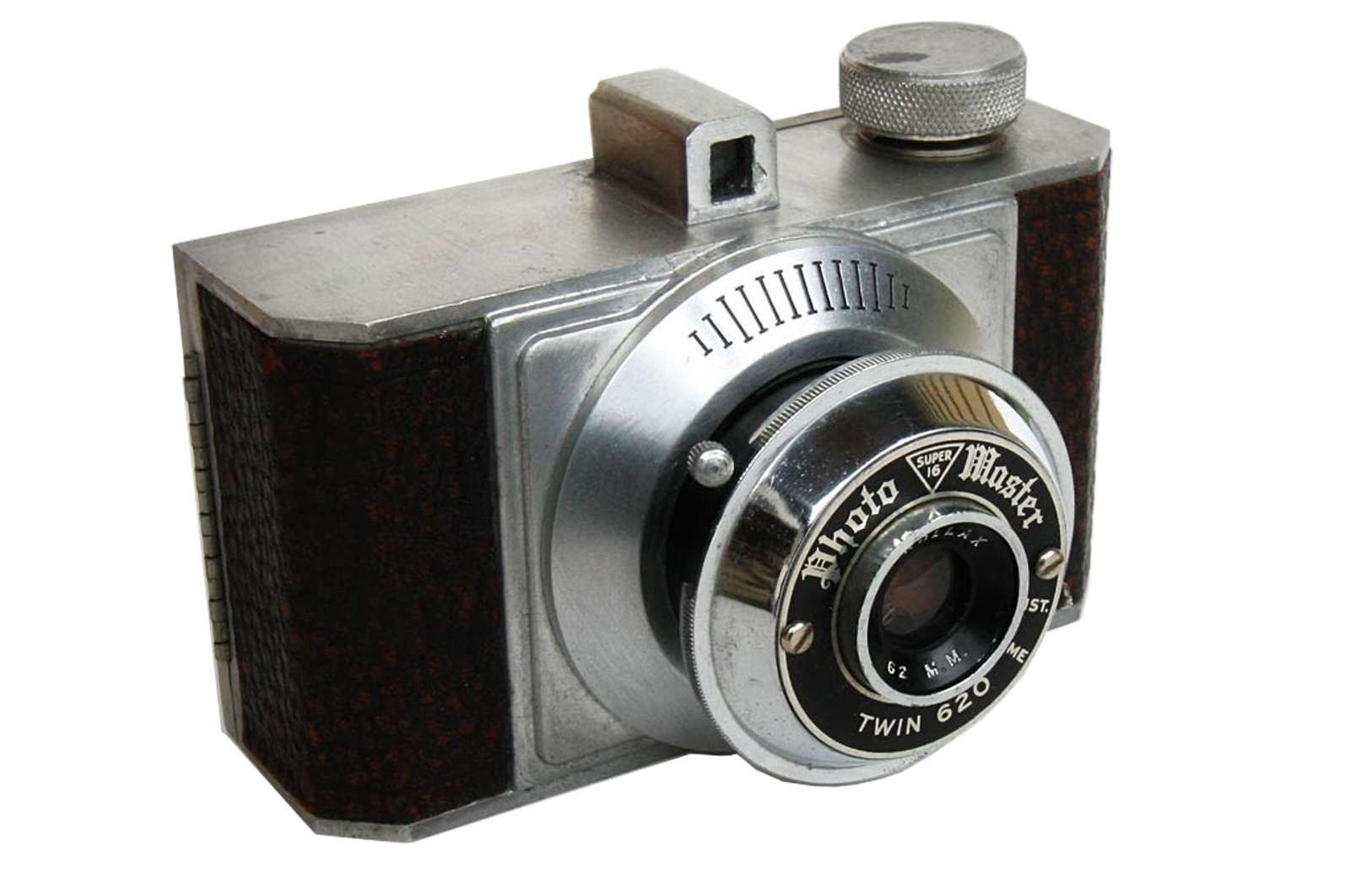 The Rolls Photo Master Twin 620 camera was marketed by the Rolls Camera Manufacturing Company in circa 1940. It was an inexpensive 35mm camera featuring quality lens and shutter. It appears to be the same camera as the Rolls Twin 620, but it does not have a collapsing lens. It was constructed of cast metal the the eye-level view finder built-in and covered with leatherette. The camera was capable of capturing sixteen 2 1/4 x 1 5/8 inch sized exposures on number 620 or PB-20 roll film. It featured a Rollax fixed focus f16 62mm lens and an instantaneous and time exposure shutter.