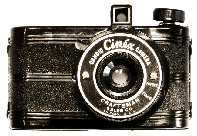 The Cinex Candid Camera was marketed by the Craftsman Sales Co. of Chicago, Illinois in circa 1940. This was a typical Chicago Group style camera and similar to the Monarck. This mini-cam camera was made from plastic bakelite, with a built-in view finder and a metal faceplate indicating the camera name in bold lettering. The camera was capable of capturing full or half frames on no. 828 roll film.