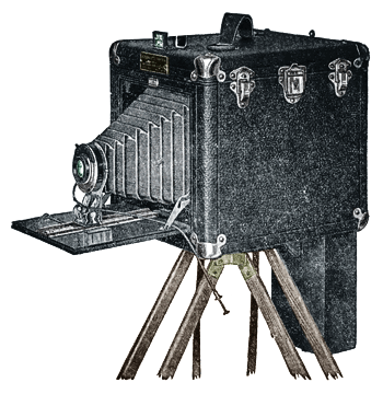 The B-W DAYDARK Camera was manufactured by the Daydark Specialty Company of St. Louis Mo. in circa 1907. Model B-W was a professional street camera capable of making full standard Black and White photo postcard pictures on tin or directly on various post card stock sizes including 1 3/4 x 2 1/2, 2 1/2 x 3 1/2, 3 x 4 1/2 or 3 1/4 x 5 1/2 inches. The camera was well made with the camera box made of well seasoned basswood covered with heavy and durable seal grain Keratol covering. It was fitted with a leather bellows, a solid leather carrying handle and the hardware was made from brass that was heavy plated with nickel. A door on the top of the camera opens to a ruby window so that you can see the inside of the box while working. It featured an instantaneous shutter with adjustable shutter and a wire release cord. An extra rapid rectilinear lens, focusing scale and a folding brilliant direct view finder are included.