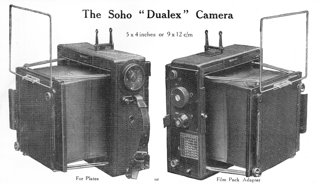 The Soho Dualex Camera was manufactured in circa 1930 by Kershaw and sold through Soho Ltd. of London. This Press type camera combined the needs of a press camera with those requiring the speed of a focal plane shutter and provided two exposure sizes. Through the use of an adapter it could accept single metal sheaths carrying 9 x 12 cm plates or it could be used as a 5 x 4 inch camera fitted with double block form slides for plates. The camera body was manufactured of well seasoned mahogany and covered with real leather. Teh front can be extended by means of two metal grips to a fixed point, supported by four metal struts providing extreme rigidity. It featured rising and cross front, a direct vision wire view finder, focusing screen and hood. The focal plane shutter provided speeds from 1/10 to 1/1000 of a second. The camera was priced at £18 10s 0d without a lens. Lens options included a Soho Anastigmat lens, Ross Expres lens, a Dallmeyer and Cooke Aviar Lens.