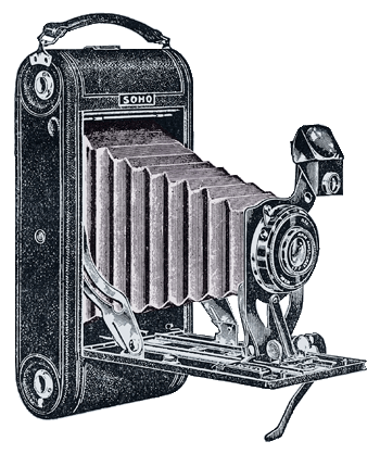 The Soho Laltrex Camera was manufactured by the Soho Ltd. company in circa 1930. A folding roll-film camera capable of capturing 5 1/2 x 3 1/4 inch "postcard" sized images. Similar to the Altrex, Celtrex, and Feltrex except in postcard size. Teh body was constructed of wood and aluminum, covered with real leather. The film are held in spindles instead of the swing out cradles found in the smaller sizes. Features included a focusing scale, and a reversible view finder. It was sold with multiple shutter / lens choices combinations. The basic version was fitted with a shutter capable of providing 1/25, 1/50 or 1/100, and time with either a Single Achromatic or Kershaw Annar f8 lens. An upgraded option consisted of a shutter capable of providing 1/5, 1/10, 1/25, 1/50or 1/100 with a Kershaw Anastigmat. The Soho Laltrex was priced at £5 0s 0d to £8 0s 0d.