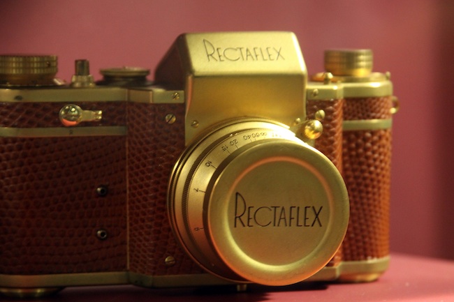 Rectaflex Gold Camera was manufactured by inventor Telemaco Corsi in Rome, Italy in c1952. It was a special 35mm camera offered to dignitaries. It featured a gold-plated finish and lizard body covering. The Rectaflex Gold was a Rectaflex series 25000 camera. The camera featured an optional synchronized flash, a shutter that provided speeds from 1 second to 1/1300 of a second and a split-image device on the focusing screen.