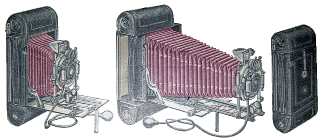 The Le Reve, vertical model camera was sold by the J. Girard & Cie. in circa 1908. It was manufactured by the Emil Wunsche company and was similar to the Wunsche Nixe-Universal camera. It was a standard pocket folding camera capable of capturing 9 x 12cm images on roll film or the back could be replaced to adapt to glass plates. Typically fitted with an Anastigmat lens in a unicum shutter.