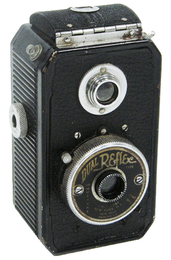 The Dual Reflex camera was manufactured by the Irwin Corporation in circa 1939. Designed as a simple twin lens or reflex-syle camera constructed of bakelite with metal plates and fittings. It was fitted with a fixed focus Acromat f7.1 lens and a rotary time instantaneous shutter. The camera was capable of capturing 3 x 4 cm exposures on standard no. 127 roll film.