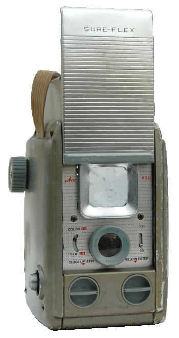 The Sure-Flex camera was manufactured by Ace Camera in Mumbai, India in circa 1960. Similar to the Anscoflex II. An all metal reflex style camera capable of capturing 6 x 6 cm exposures on no. 620 roll film. Fitted with an Ace Smitar 75mm lens. The camera has settings for black-and-white film or color, closeups, a yellow filter and shutter speed. Fairly uncommon model.