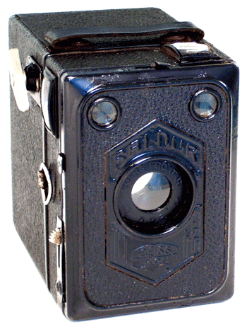 The Baldur Box camera was manufactured by Zeiss Ikon from 1933 to 1936. It was a well made box camera constructed with a two part metal case interlocked together. It was covered with imitation leather trim and the exposed metal parts finished in black enamel. It was fitted with a fixed focus Goerz Frontar Meniscus f11 lens. It also incorporated a handle, two view finders for vertical and horizontal images and two tripod sockets. The Baldur Box was made in two sizes, a 4.5 x 6cm size designated by Zeiss number of 51 and a 6 x 9cm size with Zeiss model number 51/2. Two less common variations were made similar to the Baldur box including the "Erabox" and the "Balilla".