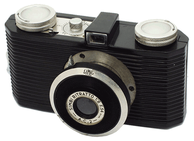 The Simbi A.C.2. camera was manufactured by the Roto company of Torin Italy in c1947. The camera was made of black bakelite plastic with a molded ribbed grain finish and a built-in optical eye-level view finder. It was similar to the Neo Photos camera. It featured a telescoping front. It was fitted with an Simbi Ritratto f8 54mm lens and a time and instantaneous shutter (P&I). The camera was made for 35mm film.