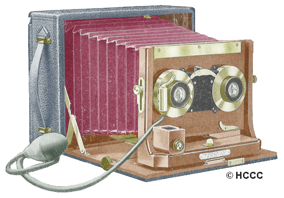 The Rochester Camera Manufacturing Company produced the Stereo Poco from approximately 1898 to 1903. Designed to meet the growing interest in stereo photography. The camera is constructed similar to the Cycle Poco No. 2. Constructed of a solid mahogany box dovetailed and highly polished. Covered with the best seal grain leather with an accompanying leather handle, polished and lacquered brass metal hardware, and a red Russian leather bellows lined with gossamer cloth. The detachable back featured a spring actuated ground glass screen with a panel for focusing. The front featured a rising and falling adjustment with a detachable lens board and rack and single rack and pinion focusing. Two tripod sockets were provided along with a combination Poco view finder and level. The lens was a rapid rectilinear with a unique Stereo Shutter with pneumatic release designed for this camera.