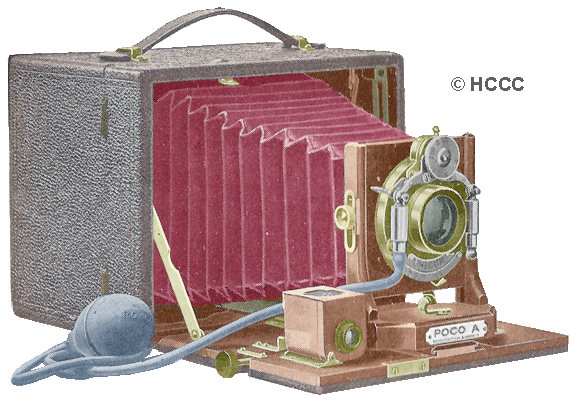 The Folding Poco Model A was manufactured by the Rochester Camera Mfg. Co. from approximately 1898 to 1905. Designed to provide all the features not necessarily available in the cycle cameras and with storage space to carry additional plate holders in the back of the camera.