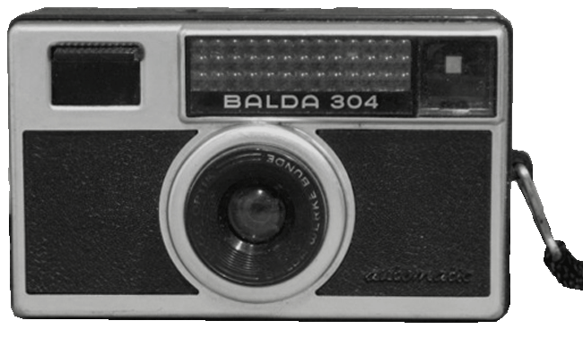 The Balda 304 Automatic camera was manufactured by the Balda Werk company in circa 1967. It was a simple inexpensive camera constructed of plastic. The camera took 28 x 28mm size negatives on standard 126 cartridge film. It was fitted with a fixed focus lens and single speed instantaneous shutter proving approximately 1/60 of a second speed. It featured a selenium cell that automatically set the aperture between 11 and 22.