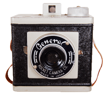 The General camera was marketed by the Rocket Camera Company in circa 1950. It was manufactured by the Maruso company of Japan. This box camera was constructed of painted tin sheet metal with a built-in optical view finder on the top of the camera. It was fitted with a simple single speed instantaneous and bulb shutter and a fixed focus meniscus lens. It was capable of capturing sixteen 4x5cm exposures on standard no. 120 roll film. The camera measures 3 1/2" tall x 3' wide x 2" depth. This camera was similar to the Palmer and the Rocket Camera.