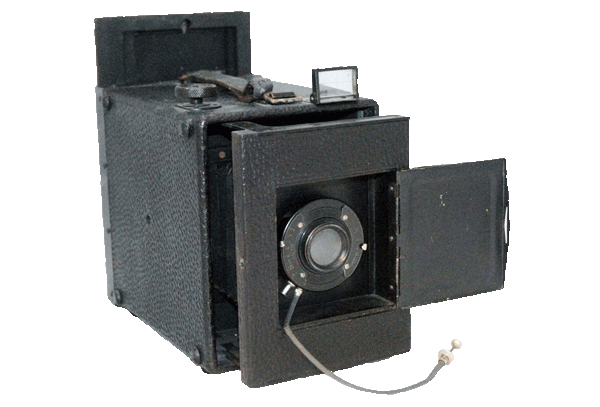The Hicro Telescoping Box Camera was sold by the Hess-Ives corporation in circa 1916. The camera was manufactured by the Hawkeye Division of Eastman Kodak. This was an improved version producing larger size "postcard" 3 1/4 x 5 1/2 images on a glass plates or Tripack film pack.. It also featured an improved adjustable rapid rectilinear f8 lens. The design sported a telescoping front and pop up lens window. The camera was constructed of wood and covered in leather. The camera measured 8 x 5 1/8 x 6 1/2 inches. The The Hicro Telescoping Postcard Box Camera was originally priced at $55.00 for the camera and one plate holder.