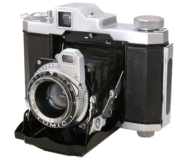 The Tomic camera was manufactured by the Toko Photo Co. Ltd. of Tokyo, Japan in circa 1952 to 1953. This SLR coupled rangefinder camera was well built with a metal body similar to the Zeiss Super Ikonta B. The top plate above the view finder has the company logo T.K.C. engraved on it. The Tomic was capable of capturing both 6x6cm and 4.5x6cm (insertion of a mask) exposures on roll film. It was fitted with a Sygmar f3.5 8cm lens mounted in a synchronized Gyrope shutter providing speeds from 1 to 1/400th of a second and bulb. Very few Tomic cameras were produced.