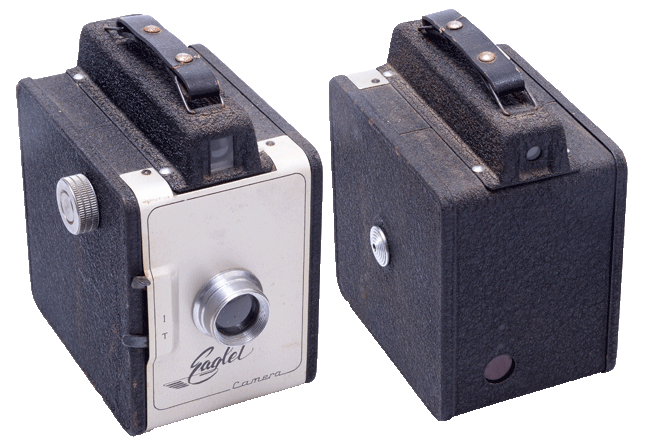 The Eaglet camera was manufactured by the Fototecnica Company of Torino, Italy in circa 1952. A box camera made with two designs. A model with a tubular eye-level viewfinder and a model with a pivoting reflex finder. Constructed of crinkle finish metal finished in black with a silver face-plate. The camera was fitted with a fixed focus lens and an instantaneous and time shutter. It was capable of capturing 6 x 9 cm exposures on no. 120 roll film.