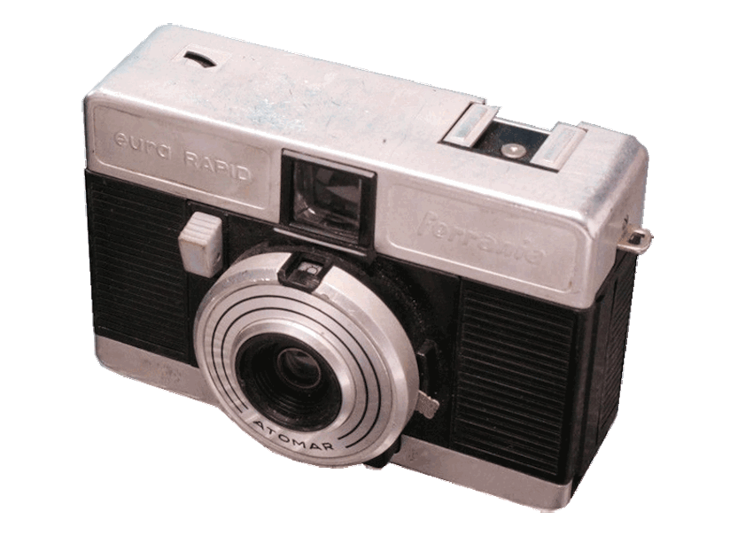 The Ferrania Eura Rapid Camera was manufactured by Ferrania company in circa 1975. An inexpensive simple viewfinder compact camera capable of taking sixteen 24 x 24 mm exposures on Agfa-Rapid film cassettes. It was fitted with a "Atomar" lens with 2 apertures f8 and f16 and with a single speed 1/50 second instantaneous type shutter.