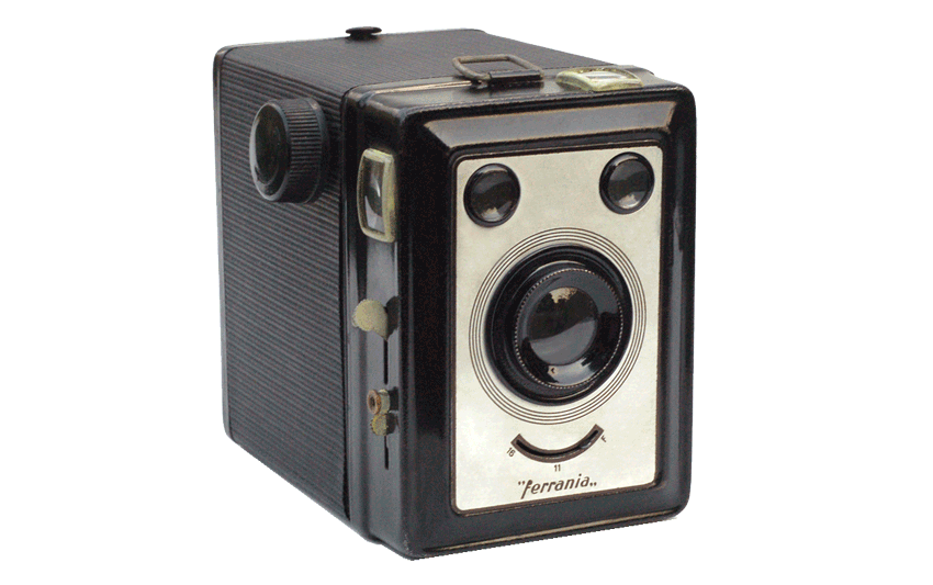 The Zeta Duplex box camera was manufactured by Ferrania in Italy in circa 1946. A simple box camera constructed of metal and partially covered in black material with the exposed metal painted black except for the face plate which was finished silver. The Zeta Duplex box is easily distinguishable from the Zeta and Duplex 2 by the distinctive film advance knob which was made of black plastic with a round shape. It was fitted with a achromatic f11 lens and an instantaneous shutter.