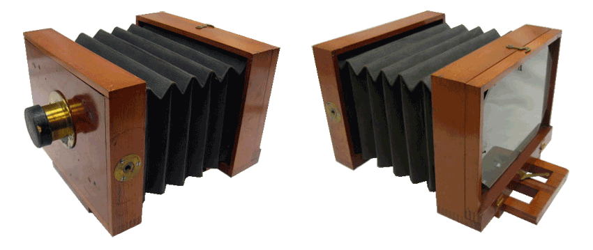 The No. 3 Eclipse Camera was manufactured and sold by E. I. Horsman in circa 1890. The entry level camera was constructed of polished hardwood with leatherette bellows and brass hardware. It accepted dry plates 4 1/2 x 6 1/2 inch in size. It came with brass meniscus lens, tripod and carrying case.