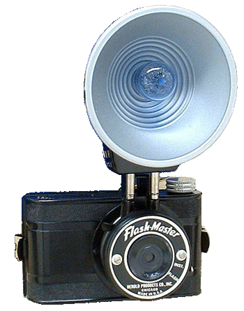 The Flash-Master camera was manufactured by Herold Mfg. Co. of Chicago in circa 1950. Similar to the Acro-Flash camera. Constructed of molded bakelite plastic with a built-in view finder. It was fitted with a fixed focus Rollax 50mm lens and an instantaneous shutter. The camera took sixteen 3 x 4 cm exposures on no. 127 or A8 roll film.