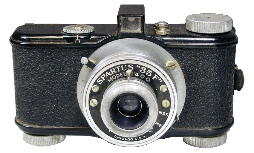The Spartus 35F 400 camera was manufactured by Herold Mfg. Co. of Chicago in circa 1950. It was a 35mm SLR camera capable of taking twenty or thirty-six shots. The camera was constructed of metal with the exposed metal parts having a satin chromium finish, the body covered in a black covering and a metal face-plate displaying the name. It was fitted with a f6.3 Archromat color-corrected lens and an instantaneous shutter plus time. The camera originally retailed for $15.95.
