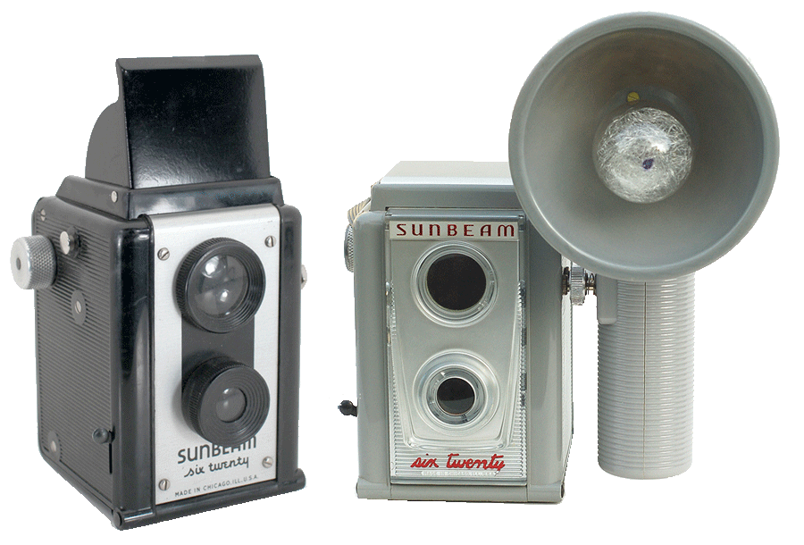 The Sunbeam Six-Twenty camera was manufactured by the Herold Manufacturing Company in circa 1950s. The Twin-lens reflex type camera was constructed of bake-lite plastic and capable of capturing 2.25 x 2.25 inch exposures on no. 620 roll film. It featured a built-in brilliant finder and Flash Synchronization. It was fitted with fixed focus meniscus lens and a single speed instantaneous shutter.