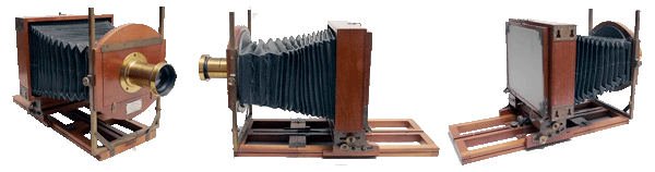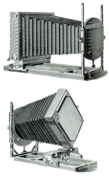 Anthony introduced the Novel and Novelette cameras in 1886 to allow the user to revolve the entire back without infringing on Flammang's revolving back patent. The Novelette cameras were available in just about all sizes made. They are constructed of first quality, highly polished mahogany. They have single and double swing backs, cone bellows and folding beds. They were very light, compact and strong. Pictures can be taken either vertically or horizontally with ease and quickly. The rear part of the camera is separated from the bed by merely pushing it from left to right, the keyhole slots releasing the heads of the screws. The front of the bellows is arranged so as to revolve in a light framework which runs on the two hollow upright brass rods. When the rear of the camera is separated from the bed he entire bellows revolves at the same time as the rear. The whole operation of reversing a 5 x 8 camera requires but two seconds by the watch.