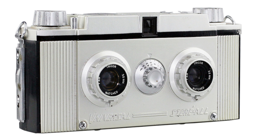 The Stere'-All camera was made by the Universal Camera Corporation in circa 1954. A stereo camera constructed of aluminum and molded plastic. It was able to capture a pair of 24x24mm stereo exposures on standard 35mm film. It was fitted with a pair if f3.5 Tricor 35mm lenses and a single speed instantaneous shutter.