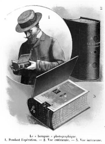 The Bouquin Photographique camera was manufactured in 1904 by Edmund & Leon Bloch. A unique camera disguised to represent a book in order to secretly capture a photo of an unsuspecting subject. Opening the books cover reveals the view finder for focusing. The finder points in a 90 degree direction to that of the front of book and to which the photographer is facing. The camera captured 45 x 107mm on glass plates.
