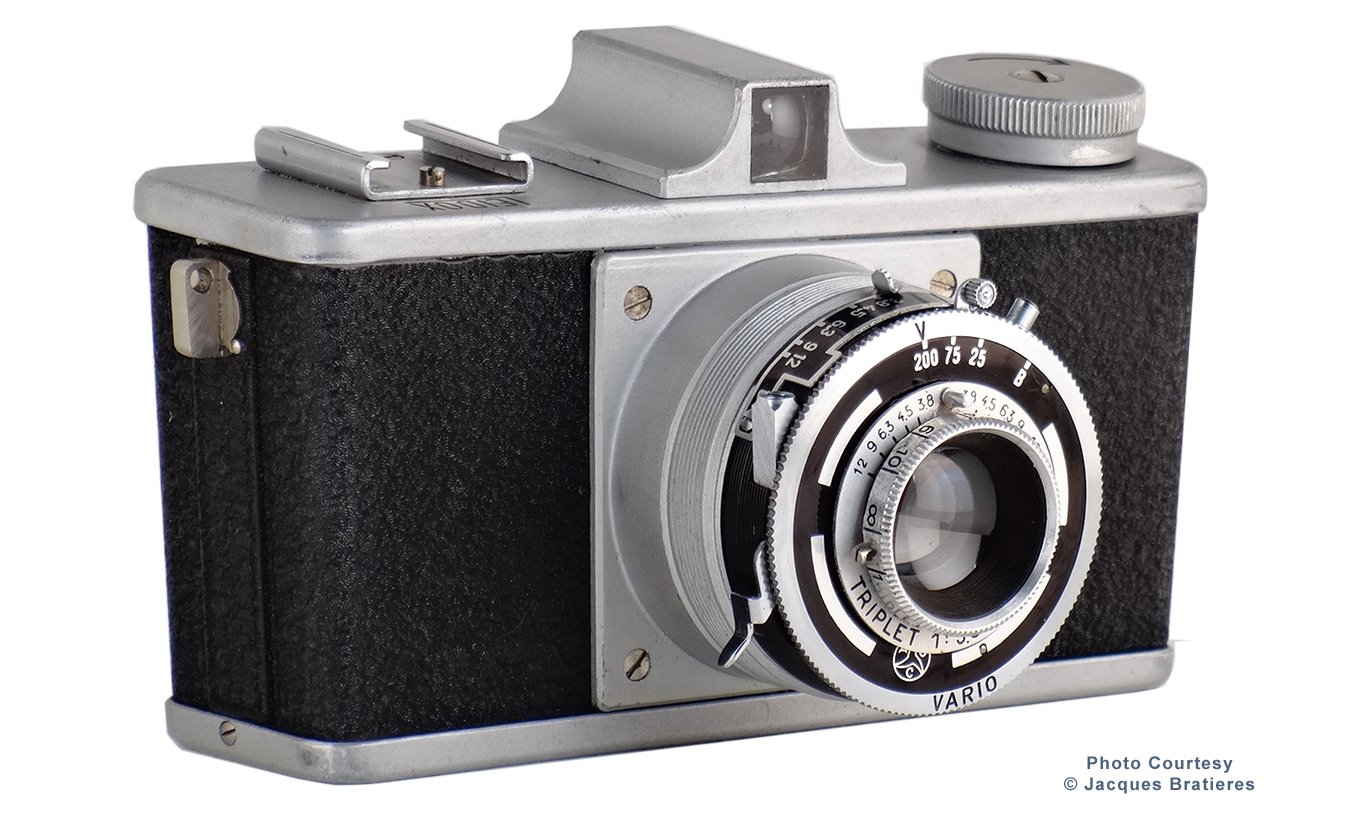 The Leidox camera was manufactured by Leidolf company of Wetzlar, Western Germany in circa 1949. A square designed camera capable of capturing 4x4 cm exposures on no. 127 roll film. Constructed of a die-cast aluminum body with black leatherette covering. It was fitted with a Triplet 50mm f3.8 lens and a Vario shutter providing 1/25th, 1/75th and 1/200th of a second speeds, plus bulb. It also featured a built-in optical view finder and flash synchronization