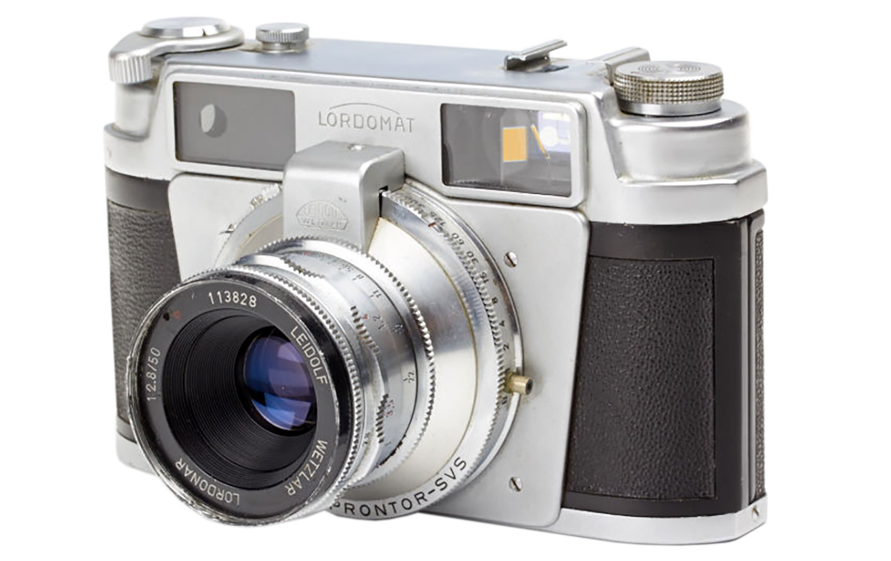 The Lordomat SE camera was manufactured by Leidolf company of Wetzlar, Germany in circa 1959. A 35 mm camera featuring a coupled rangefinder and interchangeable lenses. Stamped SE on the back top plate. Constructed of a die-cast aluminum body with leatherette covering and satin chrome trim. The camera is designed to capture twenty or thirty-six 24 x 36mm exposures on standard 35mm roll film. It was fitted with a Lordonar 50mm f2.8 coated lens and a Prontor SVS shutter providing eight speeds of 1 to 1/300th of a second, plus bulb. It also featured a built-in optical view finder, double exposure prevention and flash synchronization.