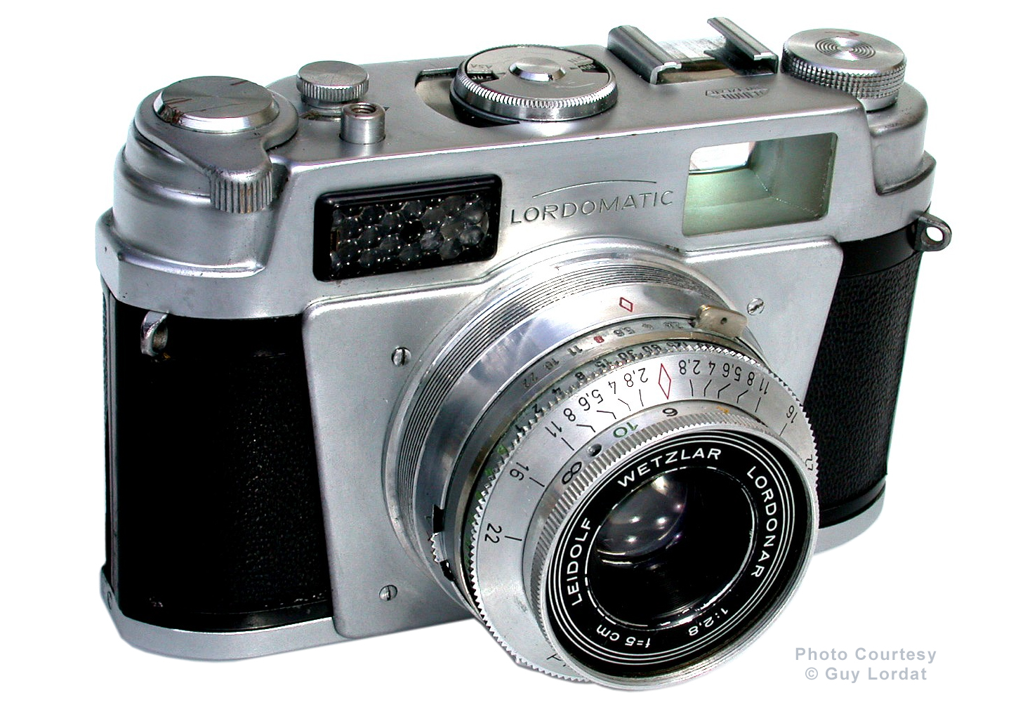 The Lordomatic camera was manufactured by Leidolf company of Wetzlar, Germany in circa 1955. A 35 mm camera featuring a coupled match-needle metering, but no rangefinder. Constructed of a die-cast aluminum body with leatherette covering and satin chrome trim. The camera is designed to capture twenty or thirty-six 24 x 36mm exposures on standard 35mm roll film. It was fitted with a Lordonar 50mm f2.8 lens and a Prontor-SLK shutter providing eight speeds of 1 to 1/300th of a second, plus bulb. It also featured a built-in bright-frame view finder, double exposure prevention and flash synchronization.