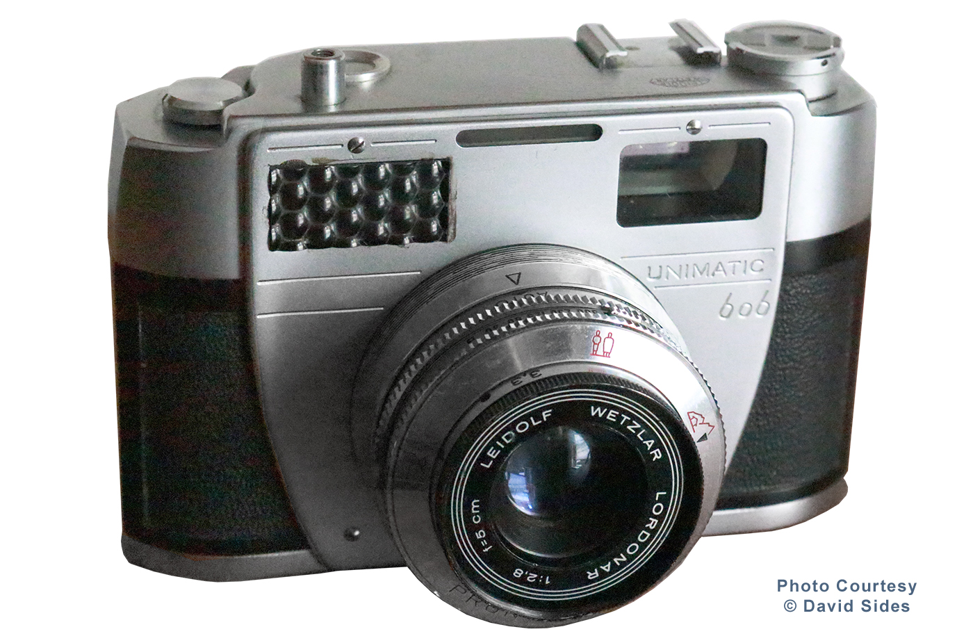 The Unimatic 606 camera was manufactured by Leidolf company of Wetzlar, Western Germany for Unimark Photo Inc. of New York in circa 1961. A well made 35mm camera featuring automatic exposure control. Similar to the Lordox Automat camera. The camera was constructed of a die-cast aluminum body with black leather covering and the exposed metal satin chromed. It was fitted with a Landonar 50mm f2.8 lens and a Prontor-Matic B shutter providing speeds from 1/30th to 1/500th of a second, plus bulb. It also featured a built-in optical view finder and flash synchronization.