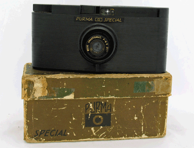 The Purma Special camera was designed by Raymond Loewy for the Purma Camera Ltd company and distributed by the R.F. Hunter company of London England from approximately 1937 to 1951. Unlike the original Speed model, the Special was constructed of plastic bakelite. It was capable of capturing sixteen 1 1/4 inch square exposures on standard No. 127 roll film. It was fitted with a Beck f6.3 three element Anastigmat lens and a three speed shutter proving speeds 1/25, 1/50 and 1/450 of a second. The lens was spring-loaded collapsing when the lens cap is installed. Another feature was a parallax-correcting built-in view finder. The Purma camera sold for $14.75 in 1939.