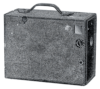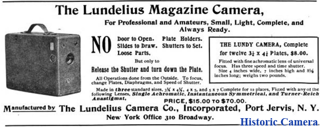 The Lundelius Magazine Camera was manufactured by the Lundelius Camera Co. Inc. in circa 1895. The camera was designed and patented by Augustus Lundelius on February 12, 1895 with United states patent 534,115. Described by Mr. Lundelius as the simplest, lightest, plainest and most complete magazine camera made. Similar to the Hetherington magazine camera but simpler in design. The magazine moved plates from the vertical to the horizontal position by a lever . It was made in three standard sizes, quarter plate or 3 1/4 x 4 1/4 inches, 4 x 5 inch and a 5 x 7 inch. Available in various lens including a Single Achromatic, an Instantaneous symmetrical, or a Turner-Reich Anastigmat. It was priced from $15.00 to $70.00.