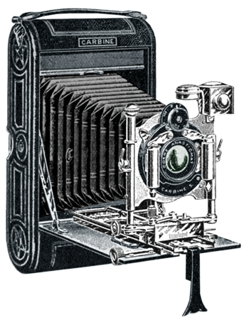 The carbine series of cameras were manufactured by the W. Butcher & Sons Ltd. companyf from approximately 1903 to 1930. Over the life of the Carbine line, many variations were produced. The were good quality, inexpensive German made roll film cameras, however they were adaptable for plates. Model No. 4 is depicted to the right. Made in quarter plate and post card sizes, except the No. 5 was also made in half plate size. fitted with various lens and shutter combinations, including Beck rapid rectilinear or Symmetrical lens and a Baush & Lomb, Primus, or simple automatic shutter.