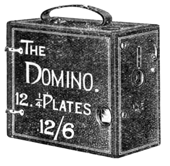 The Domino camera was manufactured by the W. Butcher & Sons Ltd company in circa 1902. During the turn of the century Butcher produced many versions of inexpensive box cameras for the amatuer market. It was produced for a short time. The Domino was a, quarter plate sized, magazine camera capable of processing twelve plates. Fitted with a good quality Achromatic lens, three diaphragms, and a shutter with time and instantaneous speeds. It featured and improved ground-glass view finder, the infallible changing system. A wood box covered in morocco grained leatherette and fitted with a strong leather handle. Originally priced at 12/6.