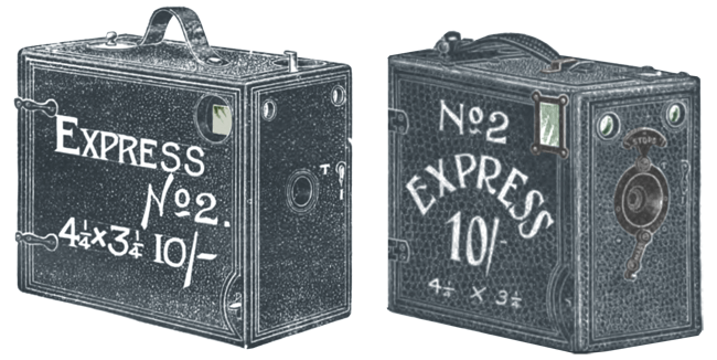 The Express Camera series was manufactured by W. Butcher & sons in circa 1902. During the turn of the century Butcher produced many versions of inexpensive box cameras for the amateur market. It was produced for a short time and went through siginficant changes as can be see with the illustration depicting the change from 1902 to 1904. A box camera constructed of a wood and covered in morocco-grained leatherette, and fitted with a strong leather handle. The no. 4 model was outfitted with a set of three magnifiers for taking images 4, 8 and 12 feet distance. Some had spirit levels and hooded finders. Fitted with an achromatic view lens and Everset time and instantaneous shutter. Four models were available.