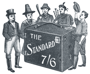The Standard Box Camera was manufctured by W. Butcher & sons in circa 1903. A box camera designed like many others of that time period as an inexpensive magazine camera with an advertising theme of the universal camera or the Standard. Constructed of wood and covered in black leatherette with a solid leather handle. It featured a good quality view lens and a time and instantaneous shutter with adjustable diaphragms. Two ground glass finders. Capable of taking twelve plates or twenty-four cut films on quarter plates (4 1/4 x 3 1/4 inches) with the infallible changing system . Originally priced at 7s 6p.