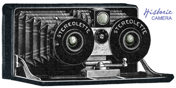 The Cameo Stereoette Camera was manufactured by the W. Butcher & Sons Ltd. company from 1910 to approximately 1915. Constructed of light metal, covered in leather and measures under 3 3/4 x 5 1/4 x 1 1/4 inches when closed. Capable of taking exposures on a 4 1/2 x 1 3/4 inch plate (107 x 45 cm). A double everset shutter is included which provides time and adjustable instantaneous exposures with bulb or finger release. Additional features include a level, an brilliant finder, rising front, rack and pinion focusing, a hooded focusing screen and a focusing scale from 4 ft to infinity. Fitted with a matched pair of rapid rectilinear lens working at f8 priced at £3 10 0, or Primar Anastigmats f6.8 priced at £8 or a Goerz Dagor lens f6.8 priced at £12.